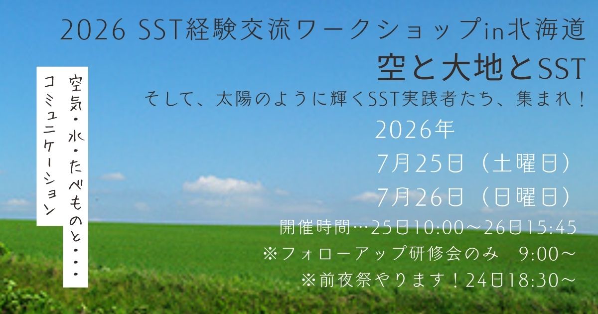 大会概要 X Facebook LINE コピー 2025.10.072025.12.07 テーマ 空と大地とSST ~そして太陽のように輝くSST実践者たち、集まれ!~ 開催日 2026年7月25日(土) 7月26日(日) 会 場 札幌医科大学 保健医療学研究棟 札幌市中央区南2条西17丁目 主 催 一般社団法人 SST普及協会 共 催 SST普及協会 北海道支部 プログラム概要 講演会 シンポジウム ワークショップ フォローアップ研修会 認定講師研修会